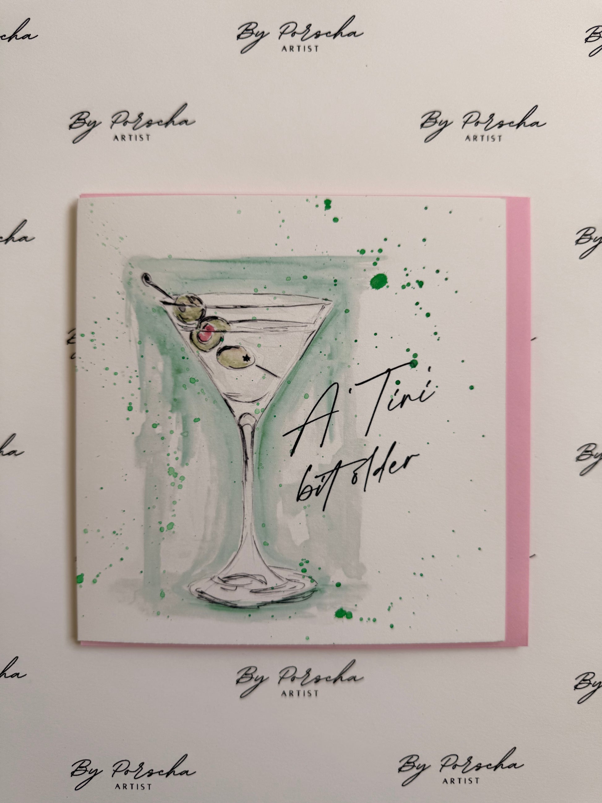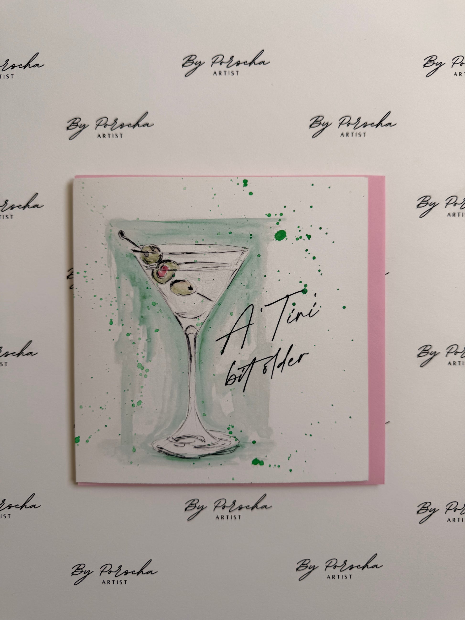 "A 'Tini' Bit Older" is written on the outside, with a blank inside for personalized messages. Hand drawn and printed by Porscha, this card is a unique and creative way to celebrate someone growing a little bit wiser.
